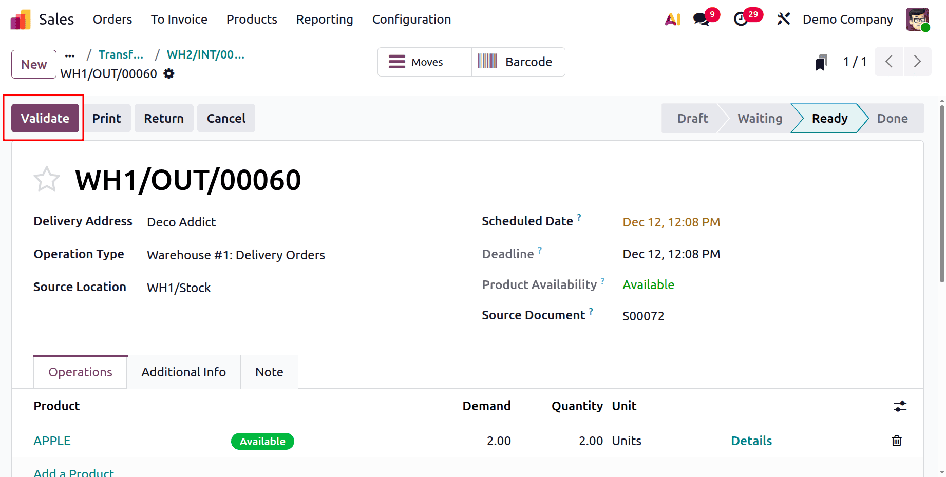 Следовательно, отгрузку должен сначала завершить пользователь демонстрационной компании. После открытия модуля продаж выберите ранее созданный заказ на продажу. Затем подтвердите отгрузку и откройте ее.