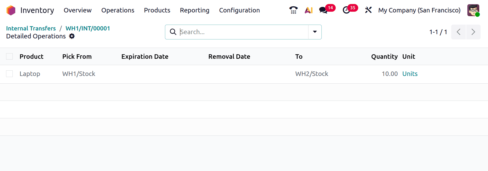 Внутренние переводы — это простой способ осуществления внутрикорпоративных операций. В качестве места отправления во внутреннем переводе следует указать место хранения первоначального склада, WH1/Stock. Место хранения второго склада, WH2/Stock, является местом назначения. После добавления продукции в необходимом количестве подтвердите перевод.