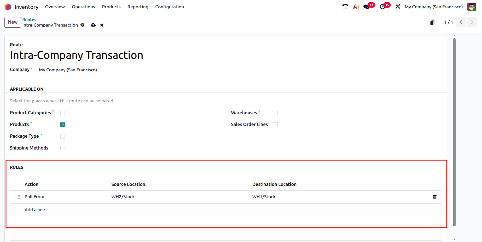Таким образом, при применении правила осуществляется внутренний перевод со склада WH2/Stock для удовлетворения потребности в товарах на складе WH1/Stock. Сохраните правило и маршрут без изменений.