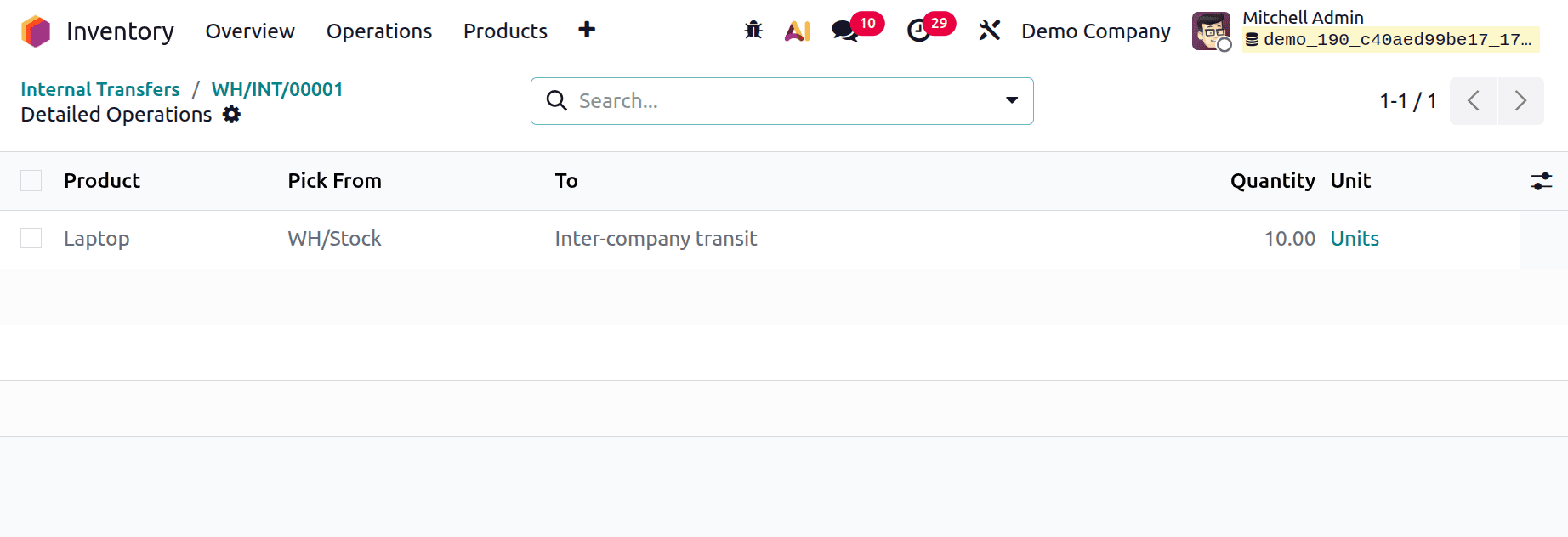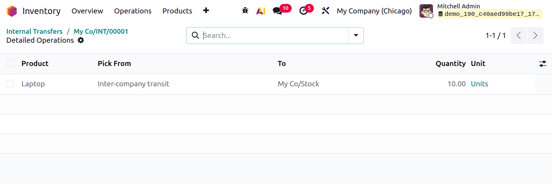 В демонстрационной компании создайте новый внутренний перевод. Тип операции: «Ваша компания: Внутренние переводы». Место назначения: «Виртуальные местоположения/Межфирменные перевозки», место отправления: «Склад/Запас». Подтвердите перевод после добавления товара с указанием количества на вкладку «Товар».
