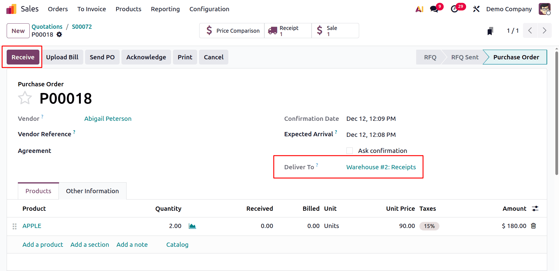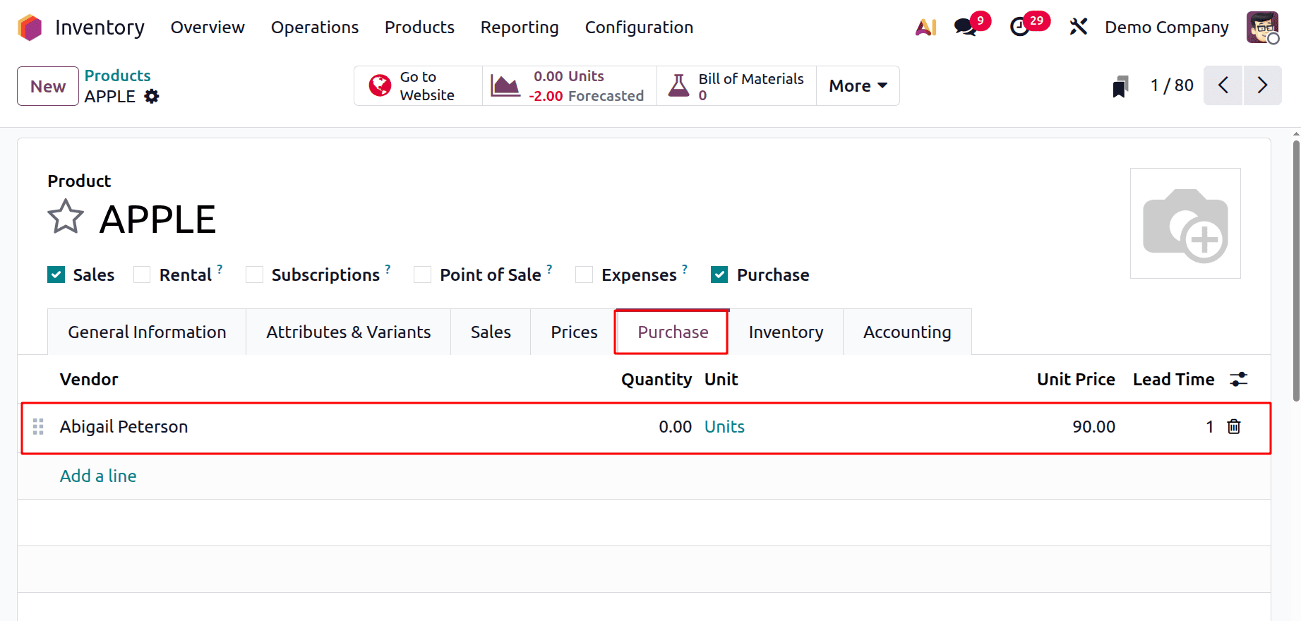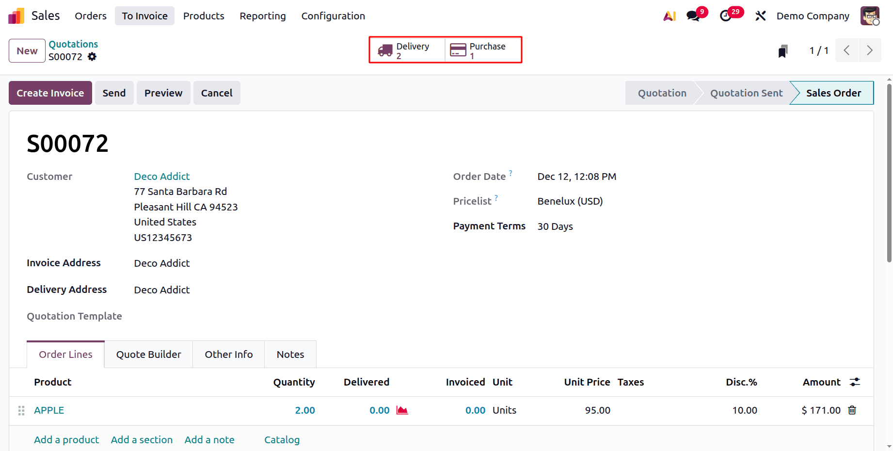Создайте новый заказ на продажу. Выбранный клиент — Deco Addicts. Добавьте товар Apple внутри рамки. Клиент запросил два тома. Красный индикатор рядом с количеством указывает на то, что товара нет на складе.