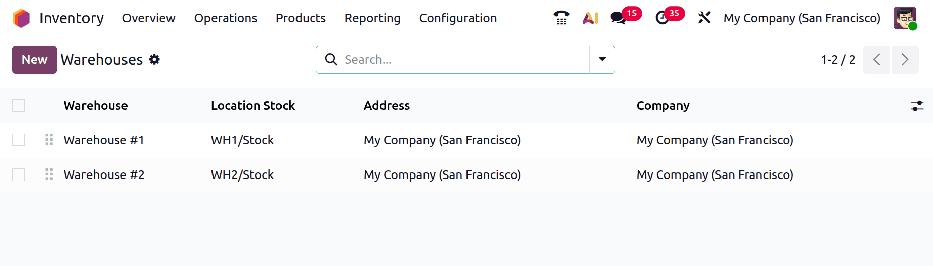 Давайте создадим два отдельных склада в рамках компании. Для этого выберите пункт «Склад» в меню «Конфигурация». Это будут два склада: Склад №1 и Склад №2 . Место хранения на первом складе — WH1/Stock , а на втором — WH2/Stock .